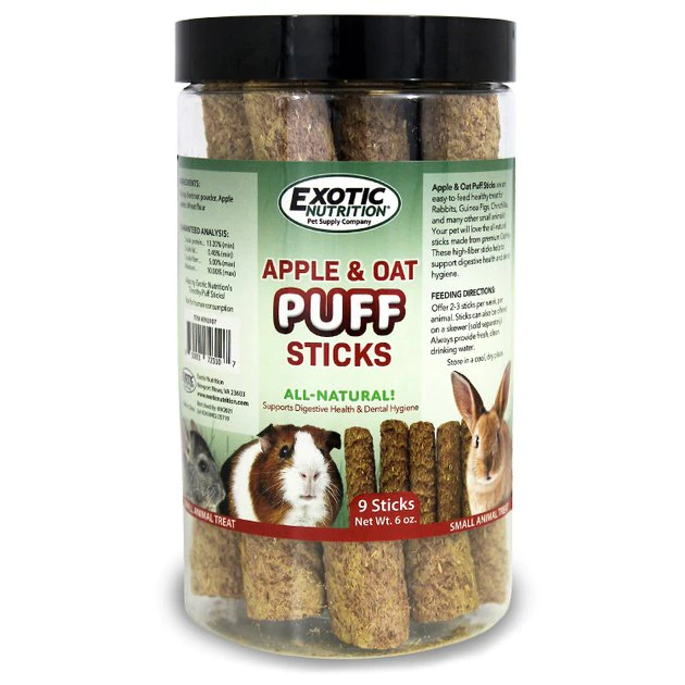 Throw a change-up into your cottontail’s carrot diet with Exotic Nutrition Apple & Oat Puff Sticks Rabbit Treats. These snack sticks are created using premium oat hay. They’re high in fiber to help support digestive health and dental hygiene in your pet pal. Ideal for rabbits, guinea pigs, chinchillas and other small animals, these tasty treats are crafted to help keep your little dude’s daily diet from becoming monotonous.