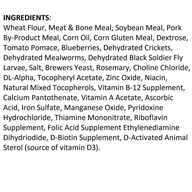Tomato Pomace, Blueberries, Dried Crickets, Dried Mealworms, Dried Black Soldier Fly Larvae, Salt, Brewers