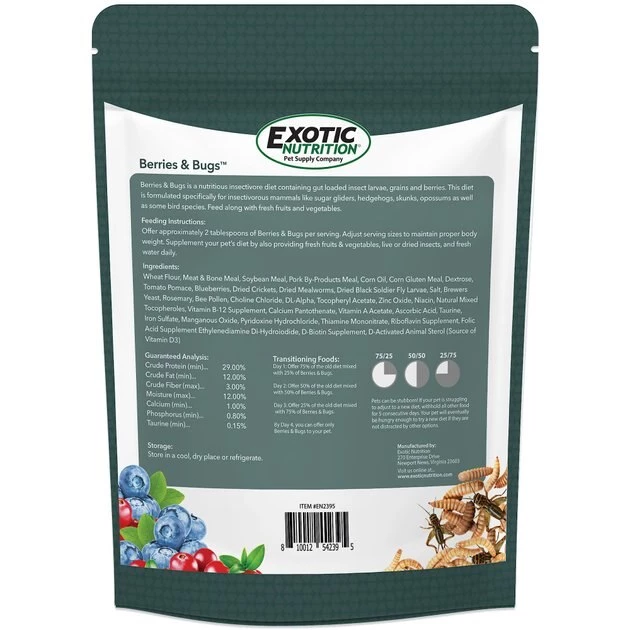 Your hedgie homeboy will have a berry good time enjoying his new Exotic Nutrition Berries & Bugs Hedgehog Food. This nutritious dry food is formulated specifically for insectivorous mammals such as hedgehogs, sugar gliders, skunks, opossums and some species of birds. It contains insect larvae, grains and berries that are fortified with vitamins and minerals. This 100% natural hedgehog food is packaged in the USA and designed to deliver a complete diet to your companion, without any additional supplements needed.