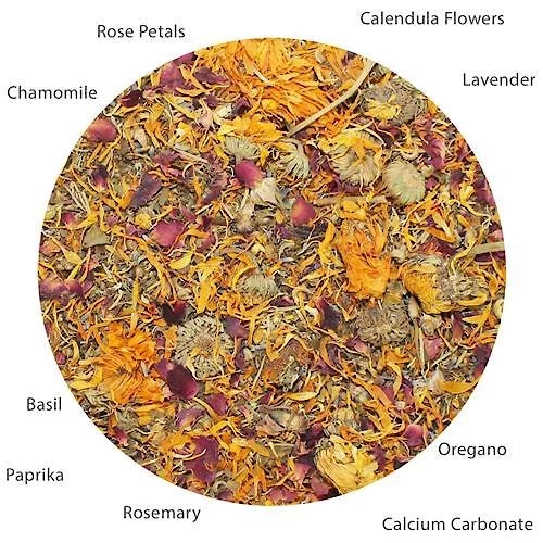 Calendula flowers, rose flowers, basil, paprika, oregano, rosemary, chamomile, lavender, calcium carbonate.
