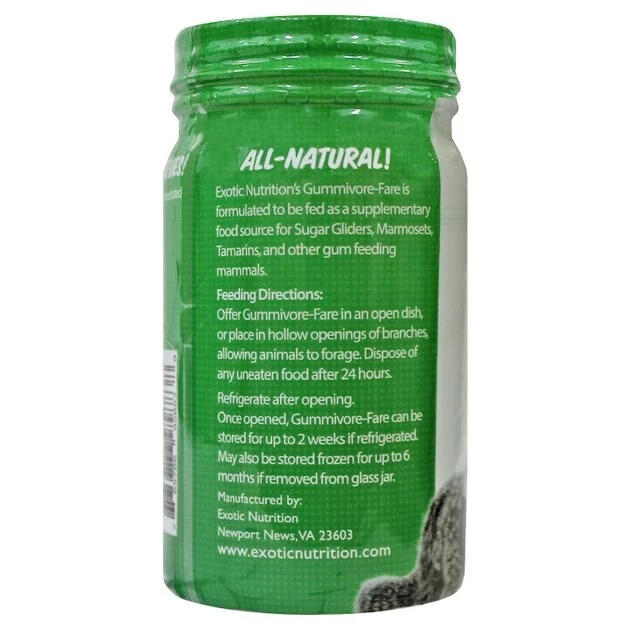 Your cute gum-eating guy is gonna chirp like crazy over his new jar of Exotic Nutrition Gummivore-Fare Original Sugar Glider Food. This supplementary wet food is fortified with a variety of vitamins and minerals for your sweet little sidekick. It’s packaged in the USA and made with a unique blend of 100% natural ingredients. It’s ideal for your sugar glider, marmoset, tamarin or other gummivore.