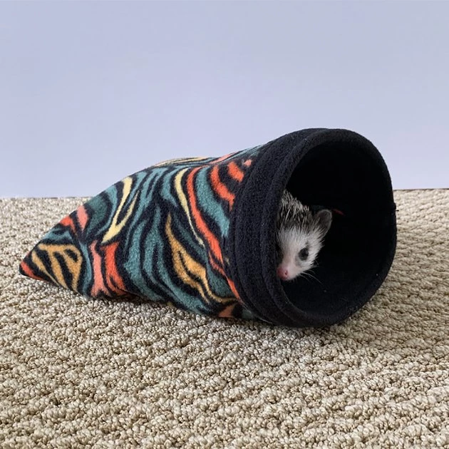 Your hedgehog will love hanging out in his new Exotic Nutrition Hangouts Hedgie Nest Small Animal Pouch. This hedgehog nesting pouch is crafted using a polar fleece material that’s soft to the touch. It’s designed to repel urine and cleans up easily in your household washing machine. The pouch is secured using heavy-duty cage clips and features hidden seams to help protect your pal from getting his nails snagged. Spacious and comfy, this pet pouch can easily hold up to three small animals at one time. May ship in any of the patterns shown.