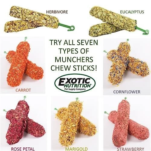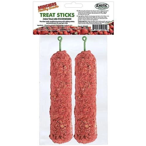 Provide your furry little friend with a natural, healthy treat with Exotic Nutrition Munchers Sticks w/ Strawberry Small Pet Treats. These ready-to-eat stick treats are made with an assortment of healthy grains and plants such as strawberries, sunflower seeds, peanuts, and oatmeal—plus, they are double-baked for a satisfyingly crunchy texture. This hard texture not only satisfies your little pal’s natural desire to chew but it also helps grind down his teeth, which is essential for good dental health. The crunchy outer layers provide your furry friend with hours of chewy fun, which can provide him with healthy behavioral enrichment and jaw exercise! These high fiber, low protein treats promote gastrointestinal health and provide your pal with essential vitamins and minerals as well. They are squeaktastic for rabbits, Guinea pigs, hamsters, chinchillas, degus, mice, rats, and other small furry friends.