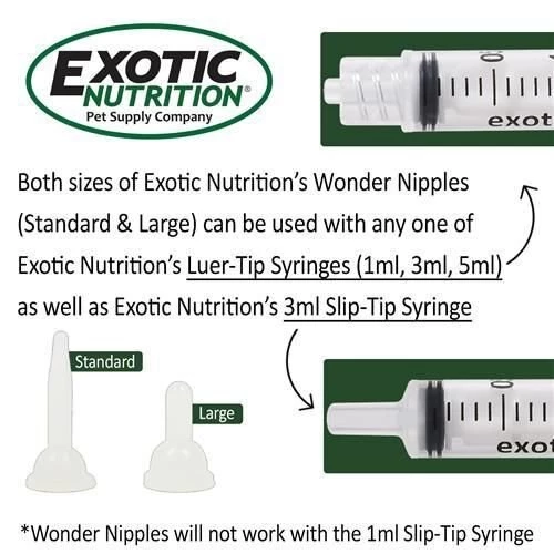 The Exotic Nutrition Wonder Nipple & Syringe Set is ideal for feeding small baby animals. The kit includes top-quality O-ring syringes, as well as flexible silicone nipples. You can pierce the nipple end with a needle, then expand the hole size to meet your flow requirements. The slip-tip syringe can be used with or without the nipples, giving you plenty of versatility in how you use the set. The set is ideal for baby squirrels, raccoons, rabbits, sugar gliders, hedgehogs and other small mammals.