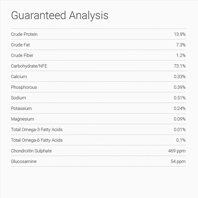 Beef, Whole Grain Oats, Wheat Flour, Wheat Starch, Glycerin, Dextrose, Flaxseed, Chicken Fat, Cane Molasses, Pork Gelatin, Water, Citric Acid for freshness, Chicken Liver Flavor, Salt, Chicken Cartilage (Source of Glucosamine Hydrochloride and Chondroitin Sulfate), Beef Flavor, Natural Flavors, Caramel color, Mixed Tocopherols for freshness, Rosemary Extract.