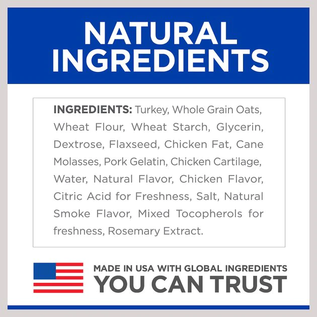 Turkey, Whole Grain Oats, Wheat Flour, Wheat Starch, Glycerin, Dextrose, Flaxseed, Chicken Fat, Cane Molasses, Pork Gelatin, Chicken Cartilage, Water, Chicken Flavor, Citric Acid for Freshness, Salt, minerals (Zinc Oxide, Ferrous Sulfate, Copper Sulfate, Manganous Oxide, Calcium Iodate, Sodium Selenite), Natural Smoke Flavor, Mixed Tocopherols for freshness, Rosemary Extract.
