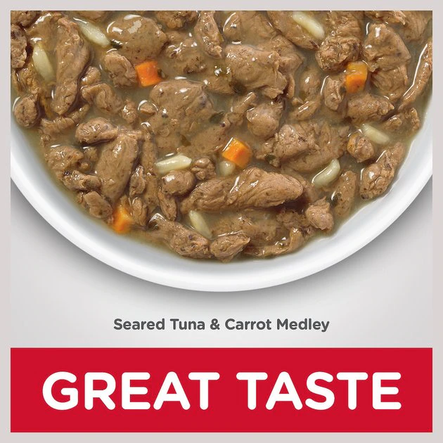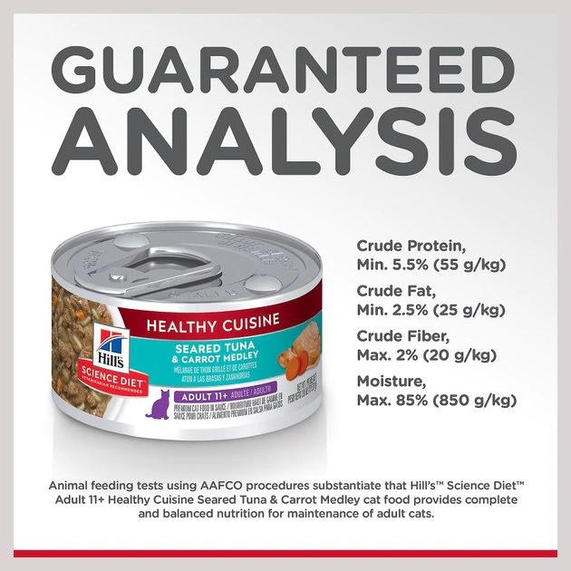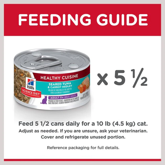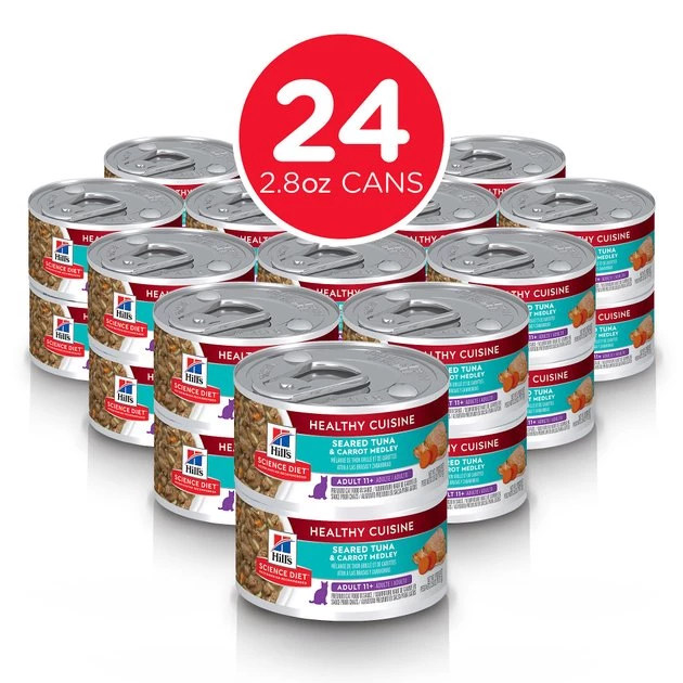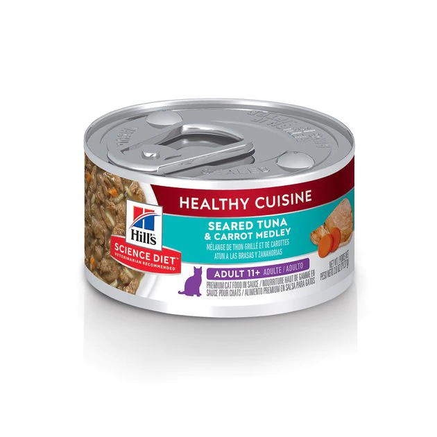 What you feed your pet matters, especially during her senior years. That’s why Hill’s has great-tasting, nutritious food to help your mature cat thrive as she continues to age. Hill’s Science Diet Adult 11+ Healthy Cuisine Seared Tuna & Carrot Medley Canned Cat Food combines the delicious flavors of seared tuna and tender carrots in a mouthwatering sauce. Free of artificial flavors and preservatives, this wholesome recipe provides your mature cat with the perfect balance of taste and nutrition.