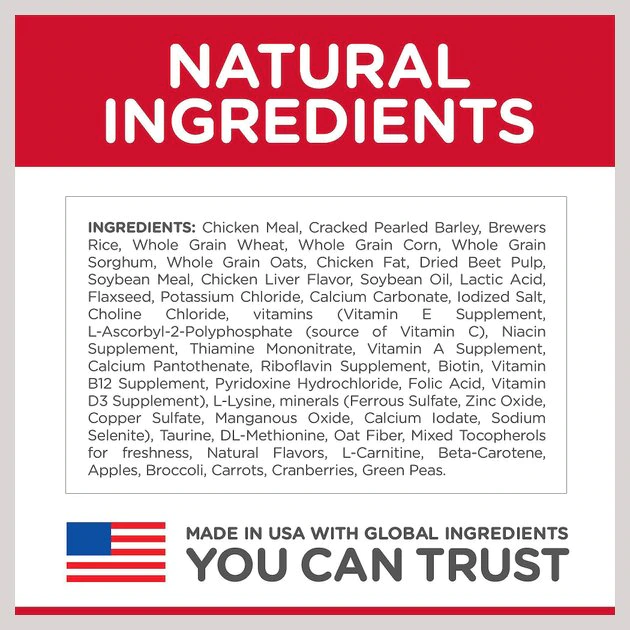 Chicken Meal, Cracked Pearled Barley, Brewers Rice, Whole Grain Wheat, Whole Grain Corn, Whole Grain Sorghum, Whole Grain Oats, Chicken Fat, Dried Beet Pulp, Soybean Meal, Chicken Liver Flavor, Soybean Oil, Lactic Acid, Flaxseed, Potassium Chloride, Calcium Carbonate, Iodized Salt, Choline Chloride, vitamins (Vitamin E Supplement, L-Ascorbyl-2-Polyphosphate (source of Vitamin C), Niacin Supplement, Thiamine Mononitrate, Vitamin A Supplement, Calcium Pantothenate, Riboflavin Supplement, Biotin, Vitamin B12 Supplement, Pyridoxine Hydrochloride, Folic Acid, Vitamin D3 Supplement), L-Lysine, minerals (Ferrous Sulfate, Zinc Oxide, Copper Sulfate, Manganous Oxide, Calcium Iodate, Sodium Selenite), Taurine, DL-Methionine, Oat Fiber, Mixed Tocopherols for freshness, Natural Flavors, L-Carnitine, Beta-Carotene, Apples, Broccoli, Carrots, Cranberries, Green Peas.