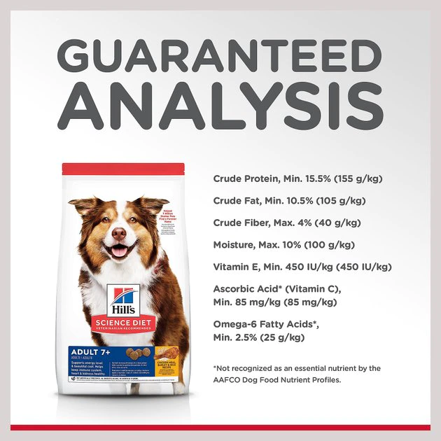 Hill’s Science Diet Adult 7+ Active Longevity Chicken Meal, Rice & Barley Recipe Dry Dog Food provides your pup with precise nutrition for a healthy lifestyle. Made with wholesome ingredients such as savory chicken meal, rice and barley, this nourishing recipe is balanced to meet your pet’s needs and help restore youthful energy. Manufactured in the United States, every ingredient meets strict requirements for purity and nutrient content which exceed industry standards. Formulated for mature dogs 7 years of age and older, this Hill’s Science Diet provides your pooch with the nutrition he needs for a lifetime of health and happiness.