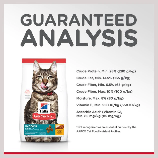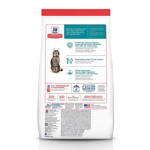 Hill’s Science Diet Adult 7+ Indoor Dry Cat Food provides your four-legged friend with great tasting nutrition for a long, happy life. Made with wholesome ingredients such as savory chicken, this nourishing recipe is balanced to meet your pet’s needs, and promote healthy, gentle digestion. Manufactured in the United States, every ingredient meets strict requirements for purity and nutrient content which exceed industry standards. Formulated for adult cats 7 years of age and older with an indoor lifestyle, this Hill’s Science Diet provides your cat the nutrition she needs for a lifetime of health and happiness.