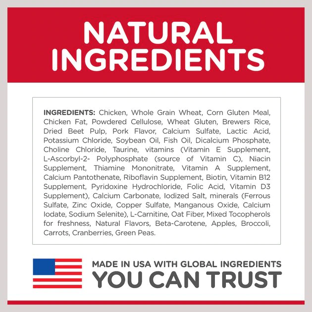 Chicken, Whole Grain Wheat, Corn Gluten Meal, Chicken Fat, Powdered Cellulose, Wheat Gluten, Brewers Rice, Dried Beet Pulp, Pork Flavor, Calcium Sulfate, Lactic Acid, Potassium Chloride, Soybean Oil, Fish Oil, Dicalcium Phosphate, Choline Chloride, Taurine, vitamins (Vitamin E Supplement, L-Ascorbyl-2-Polyphosphate (source of Vitamin C), Niacin Supplement, Thiamine Mononitrate, Vitamin A Supplement, Calcium Pantothenate, Riboflavin Supplement, Biotin, Vitamin B12 Supplement, Pyridoxine Hydrochloride, Folic Acid, Vitamin D3 Supplement), Calcium Carbonate, Iodized Salt, minerals (Ferrous Sulfate, Zinc Oxide, Copper Sulfate, Manganous Oxide, Calcium Iodate, Sodium Selenite), L-Carnitine, Oat Fiber, Mixed Tocopherols for freshness, Natural Flavors, Beta-Carotene, Apples, Broccoli, Carrots, Cranberries, Green Peas.