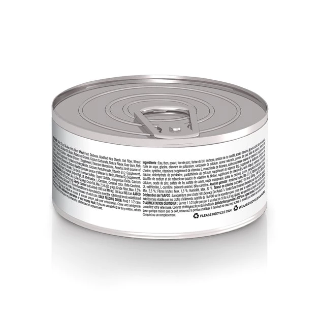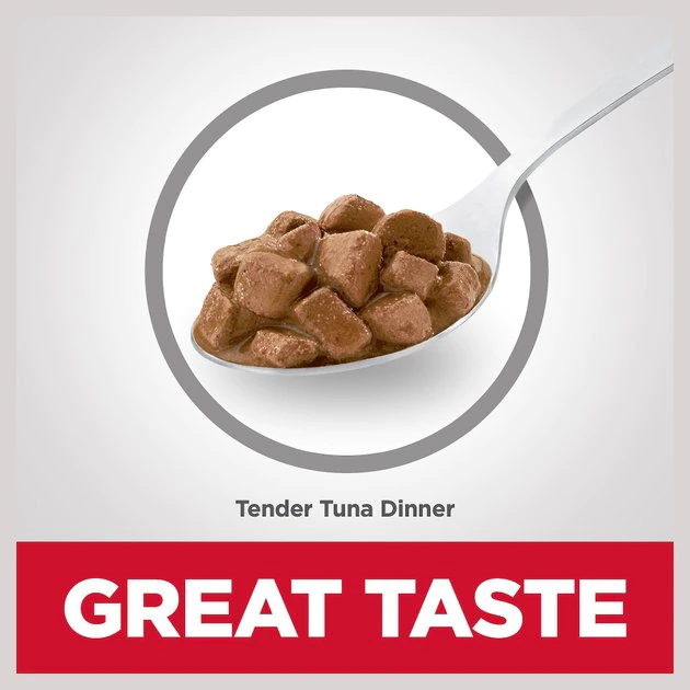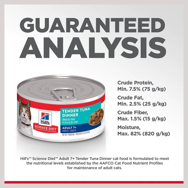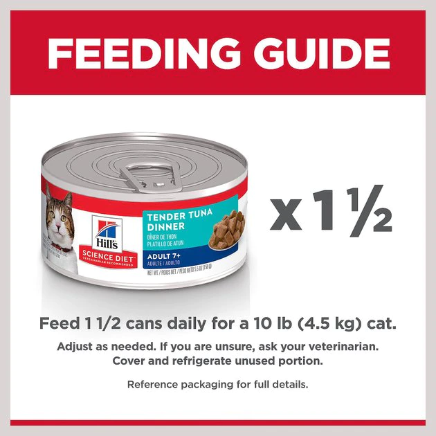 Hill’s Science Diet Adult 7+ Tender Tuna Dinner Canned Cat Food provides your four-legged friend with great tasting nutrition for a long, happy life. Made with wholesome ingredients such as tender tuna, this nourishing recipe is balanced to meet your pet’s needs, help support lean muscle and maintain vital organs. Manufactured in the United States, every ingredient meets strict requirements for purity and nutrient content which exceed industry standards. Formulated for adult cats 7 years and older, this Hill’s Science Diet provides your cat the nutrition she needs for a lifetime of health and happiness.
