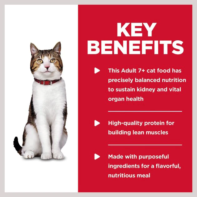 - A complete and balanced diet recommended for adult cats 7 years of age and older.