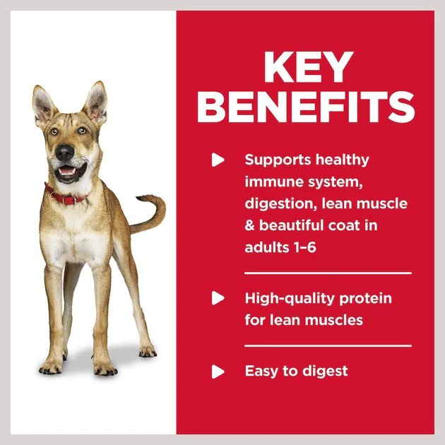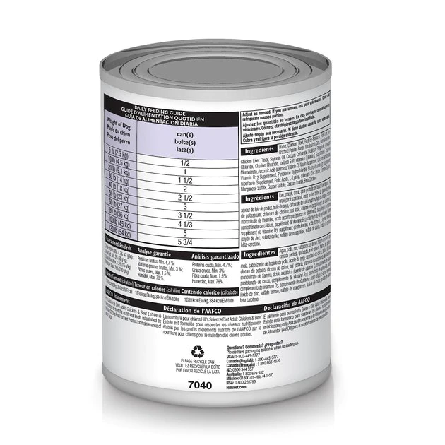 Hill’s Science Diet Adult Beef & Chicken Entree Canned Dog Food has precisely balanced nutrition to maintain advanced fitness. This delicious formula contains high-quality protein for lean muscle, promotes ideal body weight and is easy to digest.