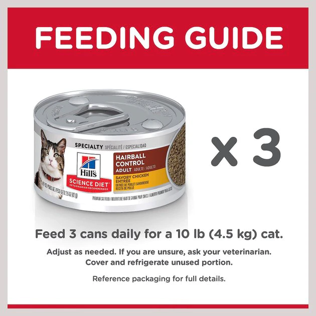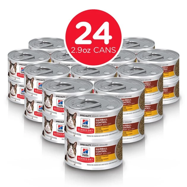 If hairballs leave your furbaby feline down, help him stay com-fur-table with Hill’s Science Diet Adult Hairball Control Savory Chicken Entree Canned Cat Food. This paw-licking-good wet food is packed with fiber to help reduce hairballs and is kind to his belly with an easy-to-digest recipe. In addition to caring for his belly, it supports his lean muscles with plenty of high-quality protein. The omega 3, omega 6 and vitamin E nutrients help take care of his skin and coat for all-over body benefits.