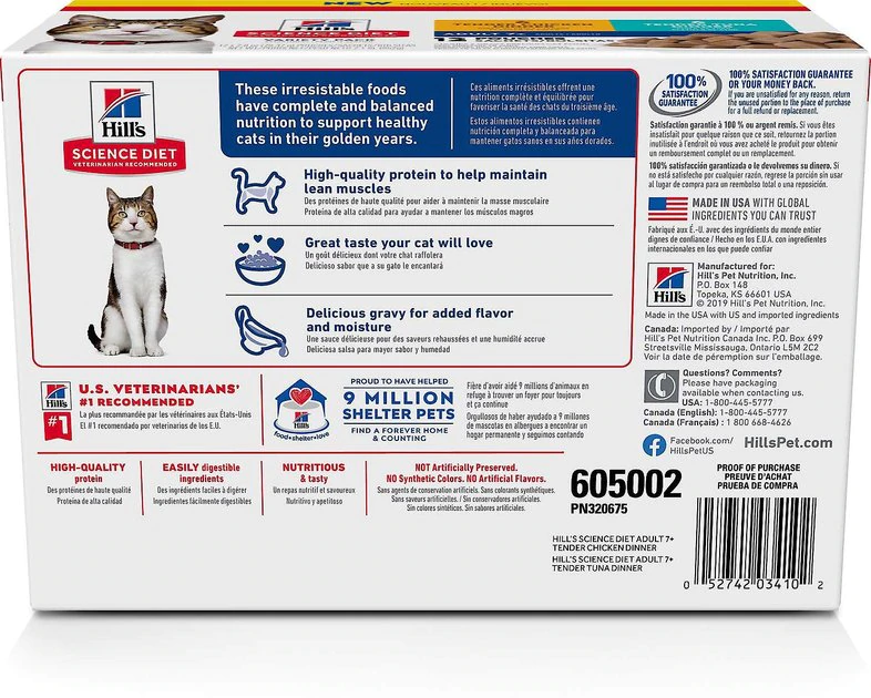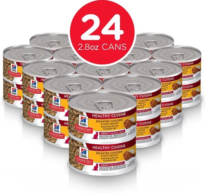 Give your cat great-tasting, nutritious food to help him thrive throughout his adult years with Hill’s Science Diet Adult Healthy Cuisine Roasted Chicken & Rice Medley Canned Food + Adult 7+ Tender Dinner Variety Pack Cat Food. Adult Healthy Cuisine combines the delicious flavors of roasted chicken and rice in a mouthwatering sauce. Free of artificial flavors and preservatives, this wholesome recipe provides your feline family member with the perfect balance of taste and nutrition. Adult 7+ Tender Dinner features decadently delicious ingredients that are tailored to your senior sidekick’s specific needs. Rich gravy adds mouthwatering flavor and consistency, while key nutrients and proteins keep his muscles performing in tip-top shape. Plus, antioxidants, amino acids and vitamins C and E support his immune system so he can take on his golden years in optimal health!