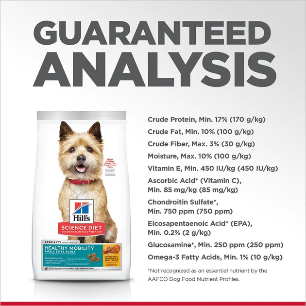 Help your small-breed canine companion prevent joint and mobility issues by feeding her the advanced nutrition of Hill’s Science Diet Adult Healthy Mobility Small Bites Chicken Meal, Brown Rice & Barley Recipe Dry Dog Food. This kibble supports hip and joint health from day one, using natural sources of glucosamine and chondroitin, which are the building blocks of healthy cartilage. It also contains a balanced set of minerals to promote strong bones and high-quality protein and natural fibers to keep your tiny sidekick satisfied between meals. This dog food is crafted with natural ingredients and contains omega-6 fatty acids and vitamin E to promote healthy skin and a shiny coat.