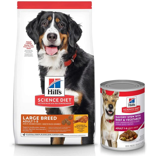 - Each purchase comes with Hill’s Science Diet Adult Large Breed Dry Dog Food, 35-lb bag & Hill’s Science Diet Adult Savory Stew with Beef & Vegetables Canned Dog Food, 12.8-oz, case of 12.