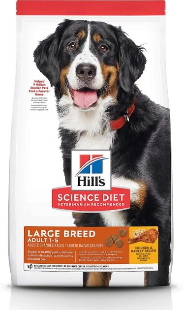 - Hill’s Science Diet Adult Large Breed Dry Dog Food features real chicken as the very first ingredient in this highly-digestible, flavorful recipe that’s scientifically formulated to provide complete and balanced nutrition.