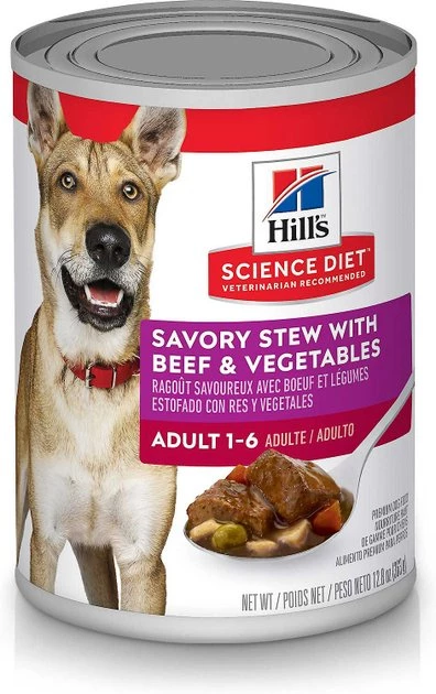 - Hill’s Science Diet Adult Savory Stew with Beef & Vegetables Canned Dog Food is formulated for your adult pooch with the paw-fect combination of essential nutrition and savory taste.