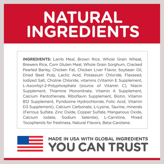 Lamb Meal, Brown Rice, Whole Grain Wheat, Brewers Rice, Corn Gluten Meal, Whole Grain Sorghum, Cracked Pearled Barley, Chicken Fat, Chicken Liver Flavor, Soybean Oil, Dried Beet Pulp, Lactic Acid, Potassium Chloride, Flaxseed, Iodized Salt, Choline Chloride, vitamins (Vitamin E Supplement, L-Ascorbyl-2-Polyphosphate (source of Vitamin C), Niacin Supplement, Thiamine Mononitrate, Vitamin A Supplement, Calcium Pantothenate, Riboflavin Supplement, Biotin, Vitamin B12 Supplement, Pyridoxine Hydrochloride, Folic Acid, Vitamin D3 Supplement), Calcium Carbonate, L-Lysine, Taurine, minerals (Ferrous Sulfate, Zinc Oxide, Copper Sulfate, Manganous Oxide, Calcium Iodate, Sodium Selenite), L-Carnitine, Mixed Tocopherols for freshness, Natural Flavors, Beta-Carotene.