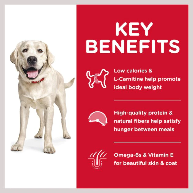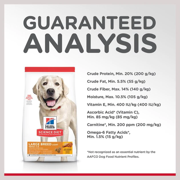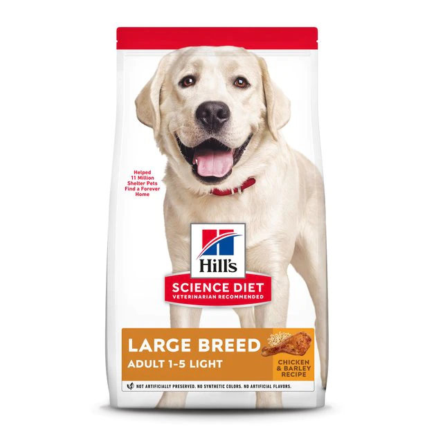 Hill’s Science Diet Adult Large Breed Light Dry Dog Food provides your pup with precise nutrition for a healthy lifestyle. Made with wholesome ingredients such as savory chicken meal and barley, this nourishing recipe is balanced to meet your pet’s needs, support energy and lean muscle, and promote healthy joints and cartilage. Manufactured in the United States, every ingredient meets strict requirements for purity and nutrient content which exceed industry standards. Formulated for large breed dogs 1 to 5 years of age with an ideal weight of 55 to 110 lbs and giant breeds 1 to 3 years of age with an ideal weight of 110 lbs and over.