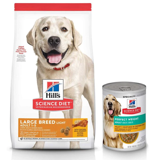 - Each purchase comes with Hill’s Science Diet Adult Large Breed Light With Chicken Meal & Barley Dry Dog Food, 30- lb bag & Hill’s Science Diet Adult Perfect Weight Hearty Vegetable & Chicken Stew Canned Dog Food, 12.5-oz, case of 12.