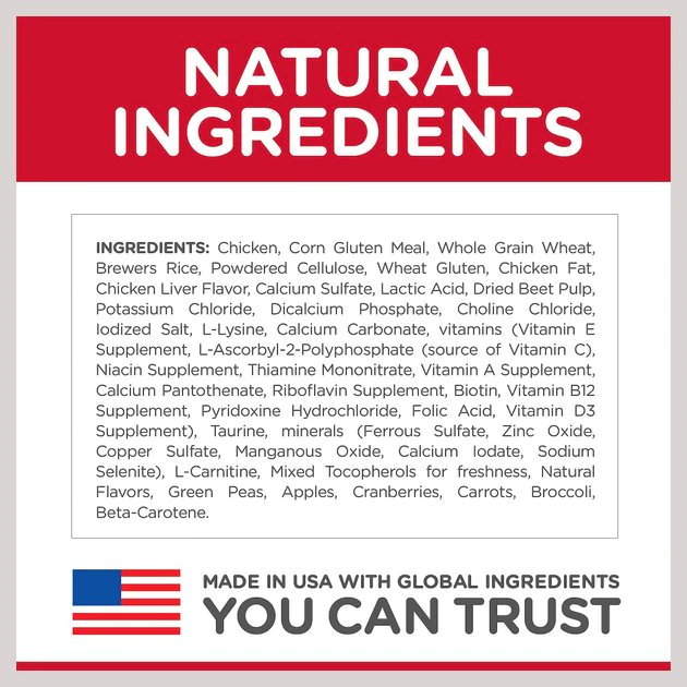 Chicken, Corn Gluten Meal, Whole Grain Wheat, Brewers Rice, Powdered Cellulose, Wheat Gluten, Chicken Fat, Chicken Liver Flavor, Calcium Sulfate, Lactic Acid, Dried Beet Pulp, Potassium Chloride, Dicalcium Phosphate, Choline Chloride, Iodized Salt, L-Lysine, Calcium Carbonate, vitamins (Vitamin E Supplement, L-Ascorbyl-2-Polyphosphate (source of Vitamin C), Niacin Supplement, Thiamine Mononitrate, Vitamin A Supplement, Calcium Pantothenate, Riboflavin Supplement, Biotin, Vitamin B12 Supplement, Pyridoxine Hydrochloride, Folic Acid, Vitamin D3 Supplement), Taurine, minerals (Ferrous Sulfate, Zinc Oxide, Copper Sulfate, Manganous Oxide, Calcium Iodate, Sodium Selenite), L-Carnitine, Mixed Tocopherols for freshness, Natural Flavors, Green Peas, Apples, Cranberries, Carrots, Broccoli, Beta-Carotene.