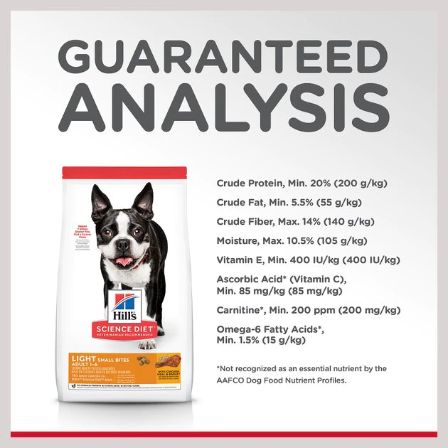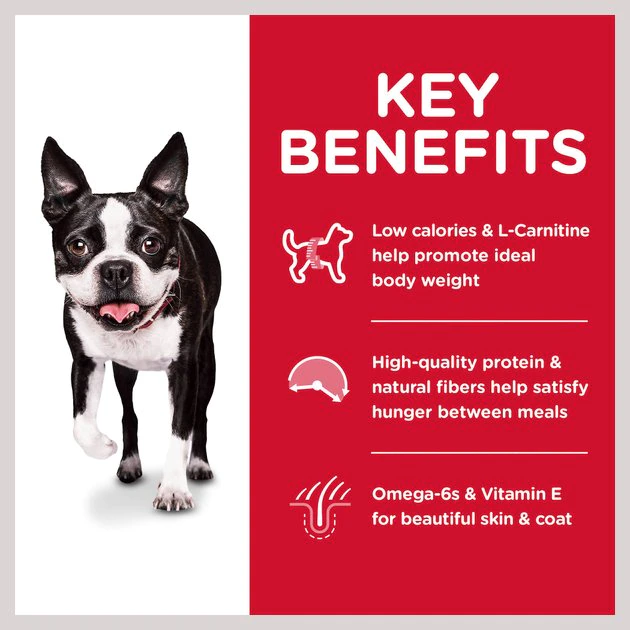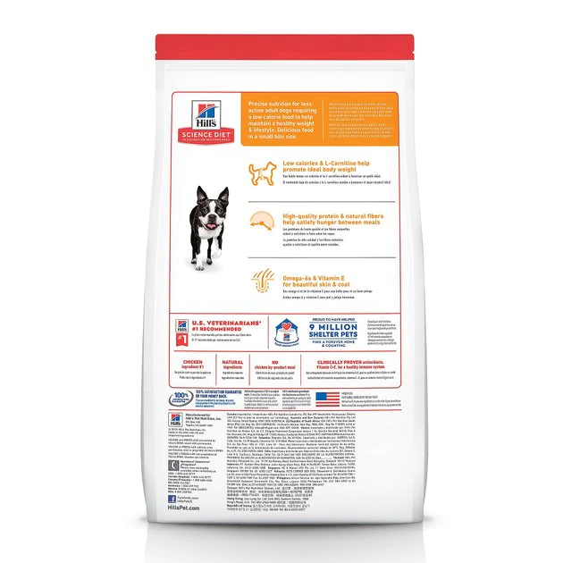 Provide precisely balanced, easy-to-digest nutrition in a smaller kibble with Hill’s Science Diet Adult Light Small Bites Dry Dog Food. This special recipe has 18% fewer calories than the Adult Advanced Fitness formula and helps your pup avoid excess weight gain. Manufactured in the United States, every ingredient meets strict requirements for purity and nutrient content which exceed industry standards. Formulated for adult dogs 1 to 6 years of age who require fewer calories, this Hill’s Science Diet provides your pooch with the nutrition he needs for a lifetime of health and happiness.