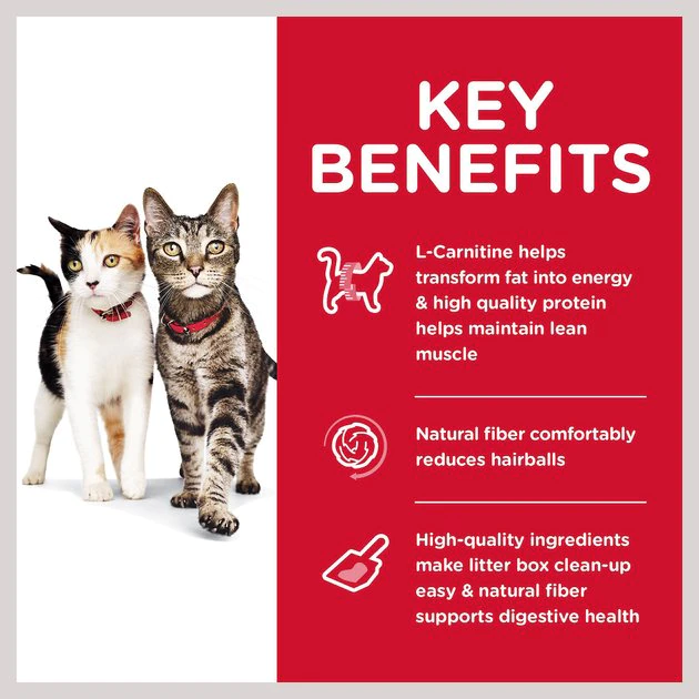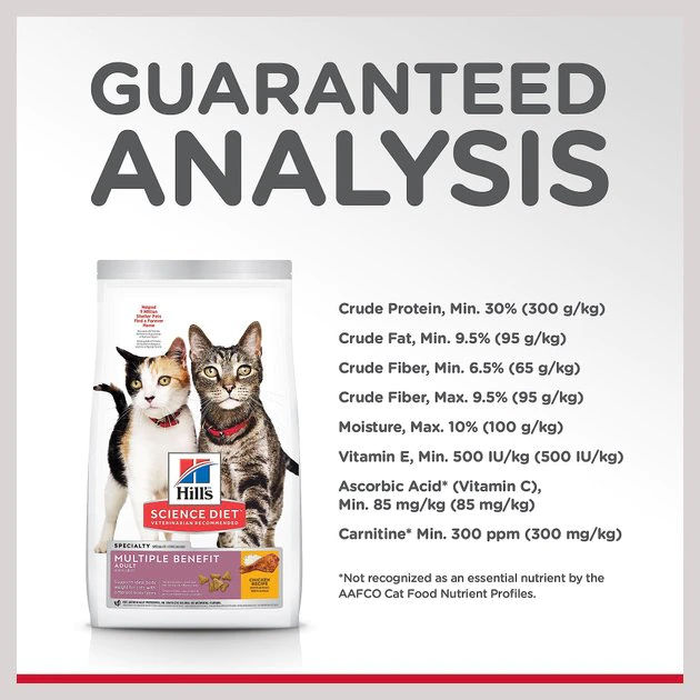 Hill’s Science Diet Adult Multiple Benefit Chicken Recipe Dry Cat Food is specially formulated to meet the many needs of adult cats with just one diet. It’s easy on the stomach with highly digestible ingredients and natural fibers that help reduce hairball formation. This food is ideal for cats of all body types because it simultaneously helps heavier cats reach a healthy weight while providing optimal nutrition to cats with a leaner build. Only high-quality ingredients are used to ensure maximum nutrient absorption, which makes for easier litter box cleanup.