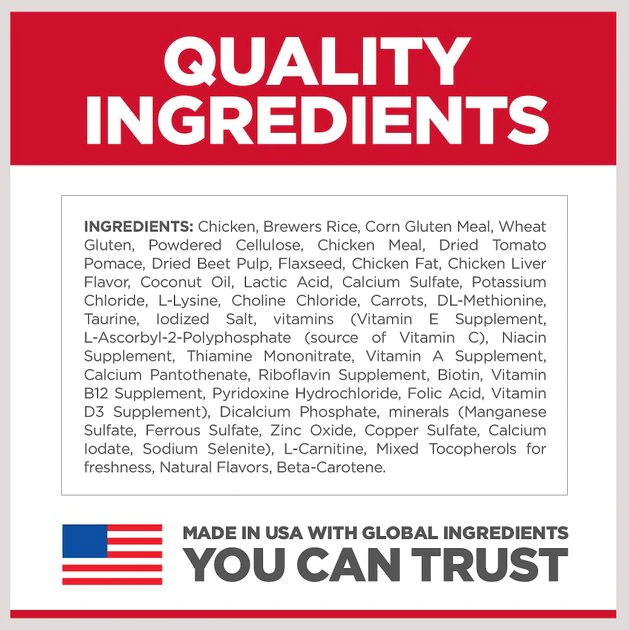 Chicken, Brewers Rice, Corn Gluten Meal, Wheat Gluten, Powdered Cellulose, Chicken Meal, Dried Tomato Pomace, Dried Beet Pulp, Flaxseed, Chicken Fat, Chicken Liver Flavor, Coconut Oil, Lactic Acid, Calcium Sulfate, Potassium Chloride, L-Lysine, Choline Chloride, Carrots, DL-Methionine, Taurine, Iodized Salt, vitamins (Vitamin E Supplement, L-Ascorbyl-2-Polyphosphate (source of Vitamin C), Niacin Supplement, Thiamine Mononitrate, Vitamin A Supplement, Calcium Pantothenate, Riboflavin Supplement, Biotin, Vitamin B12 Supplement, Pyridoxine Hydrochloride, Folic Acid, Vitamin D3 Supplement), Dicalcium Phosphate, minerals (Manganese Sulfate, Ferrous Sulfate, Zinc Oxide, Copper Sulfate, Calcium Iodate, Sodium Selenite), L-Carnitine, Mixed Tocopherols for freshness, Natural Flavors, Beta-Carotene.
