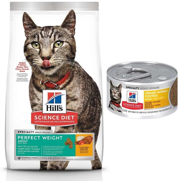 Provide your four-legged friend with great tasting nutrition for a long, happy life with Hill’s Science Diet Adult Perfect Weight Chicken Recipe Dry Food + Adult Urinary Hairball Control Savory Chicken Entree Canned Cat Food. Adult Perfect Weight is made with wholesome, balanced ingredients such as savory chicken to meet your pet’s needs, promote weight loss and maintain lean muscle. Meanwhile, Adult Urinary Hairball Control is a tasty chicken entrée that supports the health of your cat’s urinary system by providing optimal levels of magnesium. This functional food helps prevent the occurrence of urinary tract problems and also contains natural fiber to reduce hairballs, ensuring your kitty stays comfortable and calm.