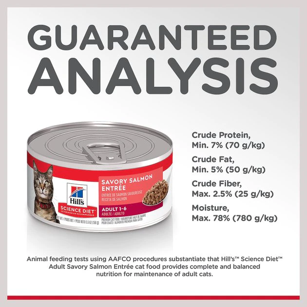Hill’s Science Diet Adult Savory Salmon Entree Canned Cat Food provides your four-legged friend with great tasting nutrition for a long, happy life. Made with wholesome ingredients such as savory salmon, this nourishing recipe is balanced to meet your pet’s needs, help maintain an ideal body weight and is easy to digest. Manufactured in the United States, every ingredient meets strict requirements for purity and nutrient content which exceed industry standards. Formulated for adult cats from 1 to 6 years old, this Hill’s Science Diet provides your cat the nutrition she needs for a lifetime of health and happiness.