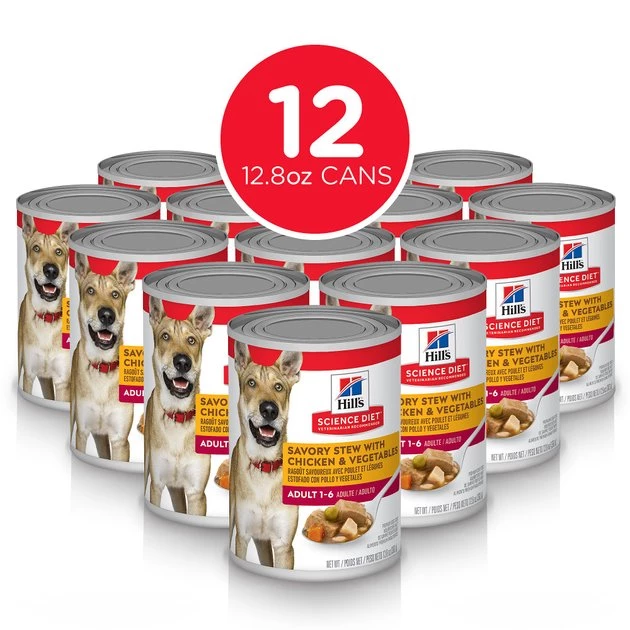 Hill’s Science Diet Adult Savory Stew with Chicken & Vegetables is a delicious way to provide precisely balanced nutrition that enhances the overall health and well-being of your pet. It is made with real chicken, brown rice and a medley of delectable vegetables including peas and carrots, all smothered in a delicious gravy.