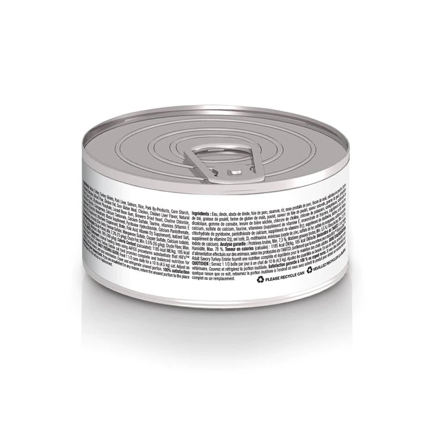 Water, Turkey, Turkey Liver, Pork Liver, Salmon, Turkey Heart, Rice, Pork By-Products, Corn Starch, Powdered Cellulose, Wheat Flour, Chicken Fat, Chicken, Chicken Liver Flavor, Egg Flavor, Corn Gluten Meal, Guar Gum, Dicalcium Phosphate, Locust Bean Gum, Brewers Dried Yeast, Choline Chloride, Carrageenan, Potassium Chloride, Calcium Carbonate, Calcium Sulfate, Taurine, Iodized Salt, DL-Methionine, vitamins (Vitamin E Supplement, Thiamine Mononitrate, Niacin Supplement, Pyridoxine Hydrochloride, Calcium Pantothenate, Vitamin B12 Supplement, Riboflavin Supplement, Biotin, Vitamin D3 Supplement, Folic Acid), minerals (Zinc Oxide, Ferrous Sulfate, Manganous Oxide, Copper Sulfate, Calcium Iodate, Sodium Selenite).
