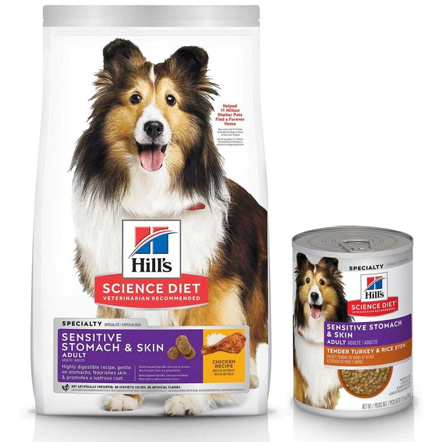 - Each purchase comes with Hill’s Science Diet Adult Sensitive Stomach & Skin Chicken Recipe Dry Dog Food, 4-lb bag & Hill’s Science Diet Adult Sensitive Stomach & Skin Tender Turkey & Rice Stew Canned Dog Food, 12.5-oz, case of 12.