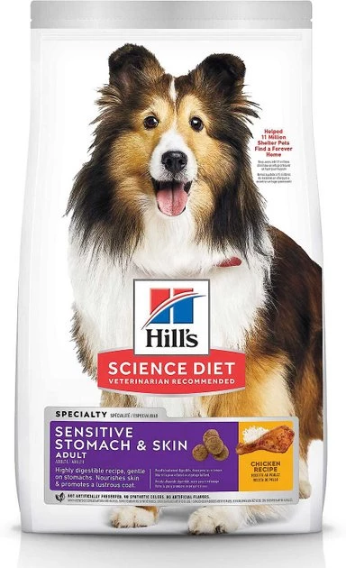 - Hill’s Science Diet Adult Sensitive Stomach & Skin Chicken Recipe Dry Dog Food contains vitamin E and omega-6 fatty acids to support healthy skin and a lustrous coat.