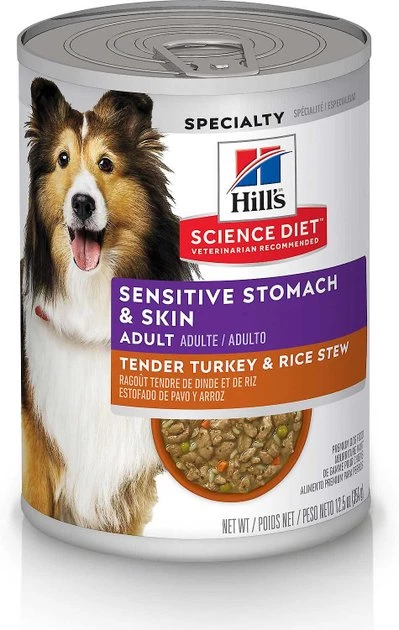 - Hill’s Science Diet Adult Sensitive Stomach & Skin Tender Turkey & Rice Stew Canned Dog Food is specially designed to support your dog’s sensitive stomach with easy-to-digest turkey, chicken and rice.