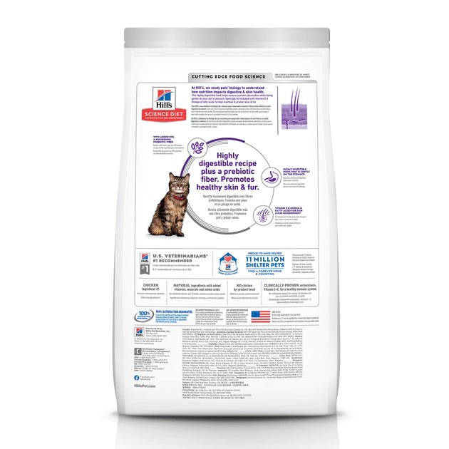 Help purr-vide your feline friend with optimal digestive health that also helps nourish her skin and promotes lustrous fur. Your kitty’s stomach health is a very important part of her everyday life, that’s why Hill’s Science Diet Adult Sensitive Stomach & Skin Chicken & Rice Recipe is crafted with natural ingredients like prebiotic fiber, to help fuel your adult cat’s beneficial gut bacteria and support a balanced microbiome. And with easily digestible ingredients, this dry cat food recipe allows her stomach to process nutrients quickly—this can lead to easier stool pickup as well. And with vitamin E and omega-6 fatty acids to nourish skin and coat health, there’s more to love with Hill’s Science Diet.