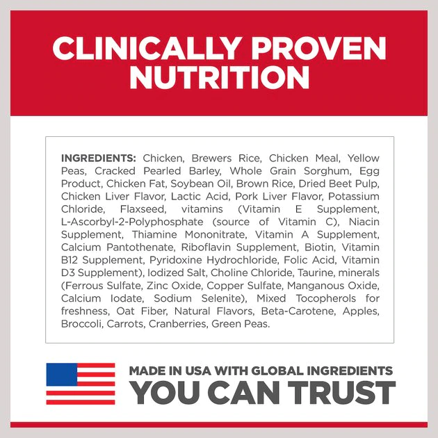 Chicken, Brewers Rice, Chicken Meal, Yellow Peas, Cracked Pearled Barley, Whole Grain Sorghum, Egg Product, Chicken Fat, Soybean Oil, Brown Rice, Dried Beet Pulp, Chicken Liver Flavor, Lactic Acid, Pork Liver Flavor, Potassium Chloride, Flaxseed, vitamins (Vitamin E Supplement, L-Ascorbyl-2-Polyphosphate (source of Vitamin C), Niacin Supplement, Thiamine Mononitrate, Vitamin A Supplement, Calcium Pantothenate, Riboflavin Supplement, Biotin, Vitamin B12 Supplement, Pyridoxine Hydrochloride, Folic Acid, Vitamin D3 Supplement), Iodized Salt, Choline Chloride, Taurine, minerals (Ferrous Sulfate, Zinc Oxide, Copper Sulfate, Manganous Oxide, Calcium Iodate, Sodium Selenite), Mixed Tocopherols for freshness, Oat Fiber, Natural Flavors, Beta-Carotene, Apples, Broccoli, Carrots, Cranberries, Green Peas.