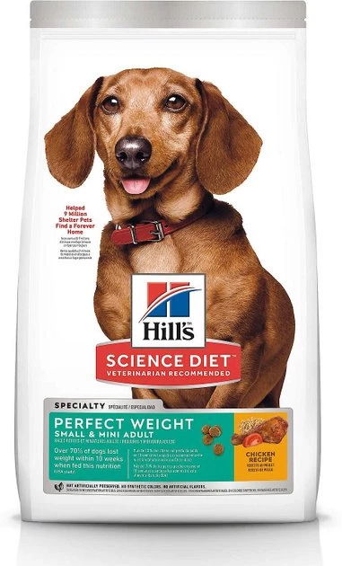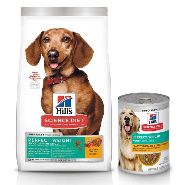 Feed your little furry friend breakthrough weight management with Hill’s Science Diet Adult Small & Mini Perfect Weight Dry Food, 4-lb bag + Perfect Weight Hearty Vegetable & Chicken Stew Canned Dog Food. The yummy dry food recipe is crafted with protein from real chicken to support lean muscle maintenance and it’s specifically designed for small and toy breed adult dogs who need to be mindful of their weight. Plus, the lean and delicious canned food recipe delivers 100% precisely balanced nutrition and contains prebiotic fibers for gentle digestion. You’ll love knowing that they’re backed by decades of cutting-edge research, and your dog will love the way every bite tastes!