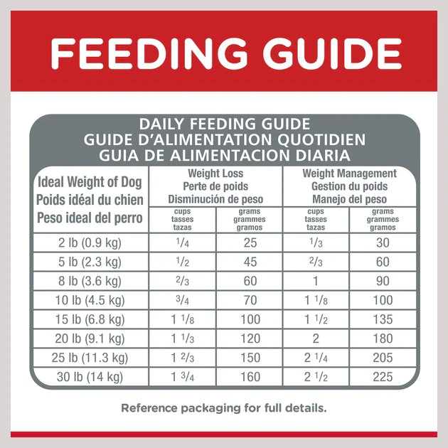 | Ideal Weight of Dog | Weight Loss (cups) | Weight Management (cups) |