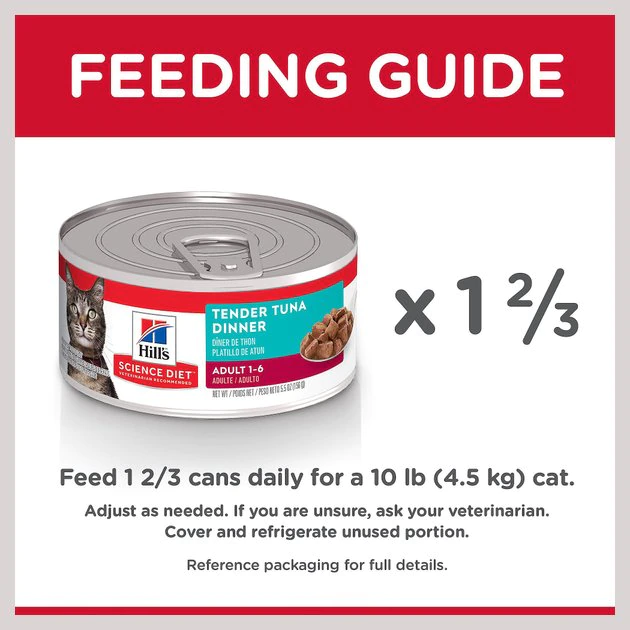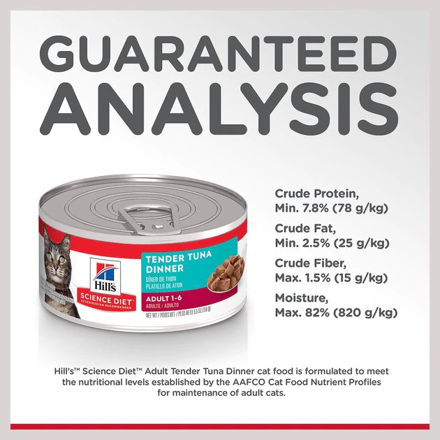 Hill’s Science Diet Adult Tender Tuna Dinner Canned Cat Food provides your four-legged friend with great tasting nutrition for a long, happy life. Made with wholesome ingredients such as tender tuna, this nourishing recipe is balanced to meet your pet’s needs, support healthy digestion, promote an ideal body weight and encourage healthy organs. Manufactured in the United States, every ingredient meets strict requirements for purity and nutrient content which exceed industry standards. Formulated for adult cats from 1 to 6 years of age, this Hill’s Science Diet provides your cat the nutrition she needs for a lifetime of health and happiness.
