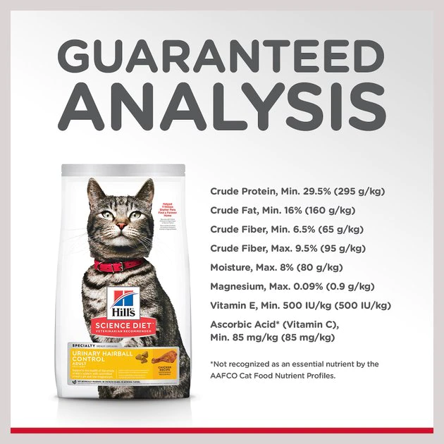Hill’s Science Diet Adult Urinary Hairball Control Cat Food is a delicious dry food made from real chicken and all natural ingredients that is specially formulated for cats. This recipe supports the health of your pet’s urinary system by providing optimal levels of magnesium. Urinary tract infections are the most common health condition in cats, so prevention is key in maintaining your cat’s health. As a functional food, the Adult Urinary Hairball Control formula helps prevent the occurrence of urinary tract problems in cats and also contains natural fiber to reduce hairballs, ensuring your cat stays comfortable and calm.