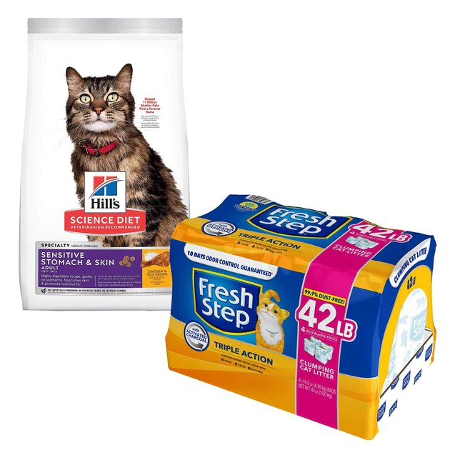 - Each purchase comes with Hill’s Science Diet Adult Sensitive Stomach & Skin Chicken & Rice Recipe Dry Cat Food, 15.5-lb bag & Fresh Step Triple Action Scented Clumping Clay Cat Litter, 10.5-lb bag, pack of 4.