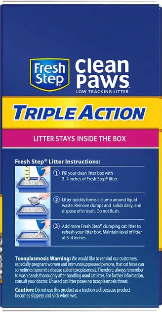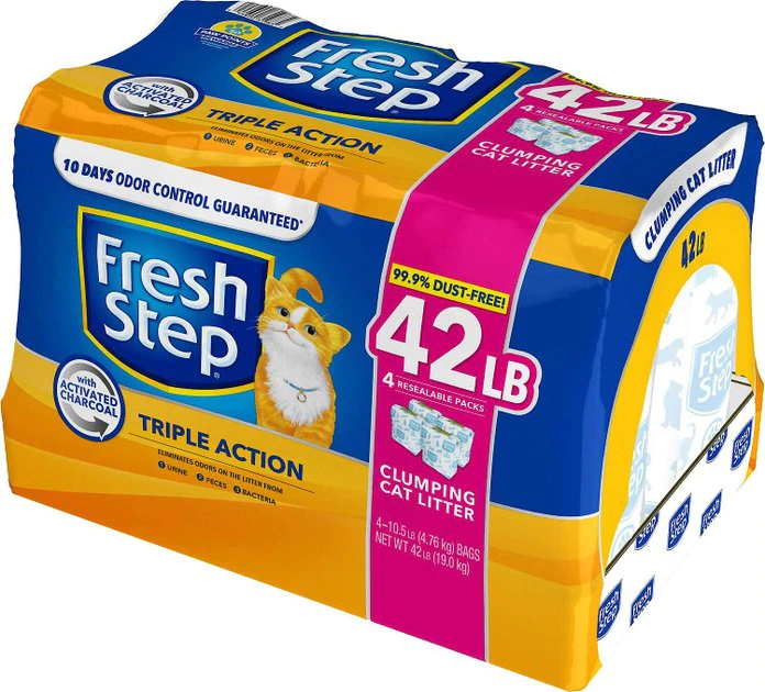 - Fresh Step Triple Action Scented Clumping Clay Cat Litter features activated charcoal and plant extracts that help trap and eliminate smells for up to 10 days.