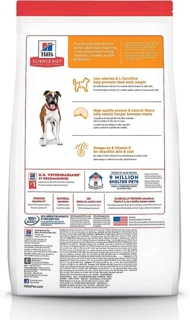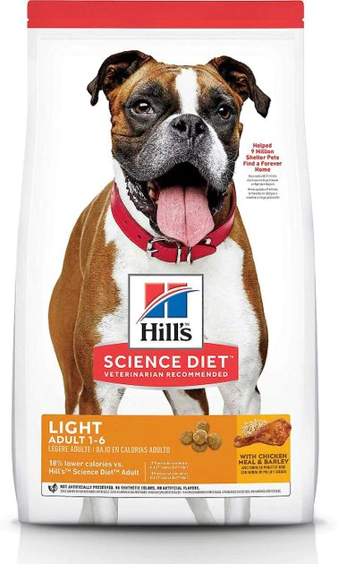 - Hill’s Science Diet Adult Light With Chicken Meal & Barley Dry Dog Food contains 18% fewer calories than the Adult Advanced Fitness recipe to help avoid excess weight gain.