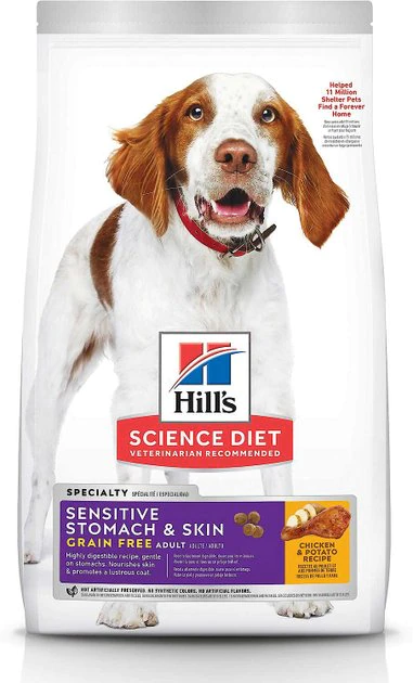 - Comes with Hill’s Science Diet Adult Sensitive Stomach & Skin Grain-Free Chicken & Potato Recipe Dry Dog Food and Hill’s Grain-Free Crunchy Naturals with Chicken & Apples Dog Treats.