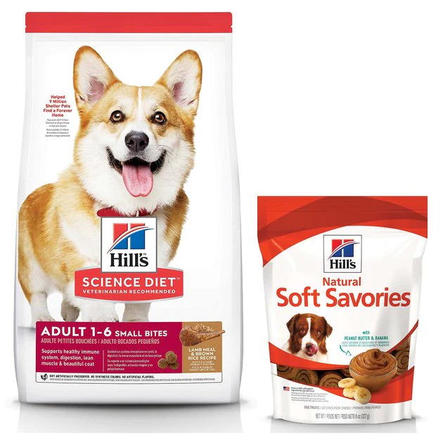 - Each purchase comes with Hill’s Science Diet Adult Small Bites Lamb Meal & Brown Rice Recipe Dry Dog Food, 33-lb bag & Hill’s Natural Soft Savories with Peanut Butter & Banana Dog Treats, 8-oz bag.