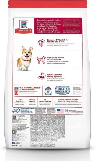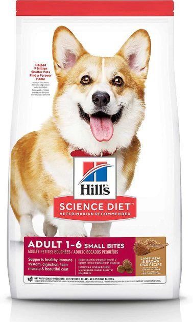 - Hill’s Science Diet Adult Small Bites Lamb Meal & Brown Rice Recipe Dry Dog Food contains omega-6 fatty acids that nourish the skin and boost coat health for a more lustrous shine.